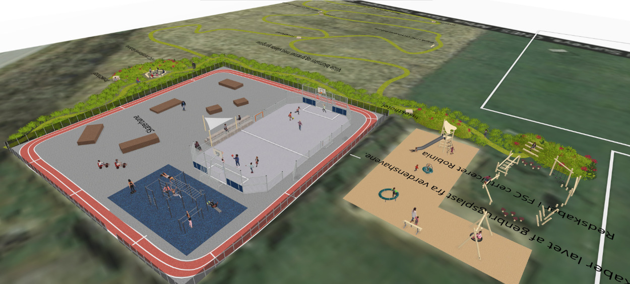 Med planer om at omdanne de nedslidte tennisbaner ved hallen til et moderne aktivitetscenter med multibane, skateområde, udefitness, legeplads og grønt område, vil vi give vores børn og unge et sted at udfolde sig fysisk og mødes i fællesskab.