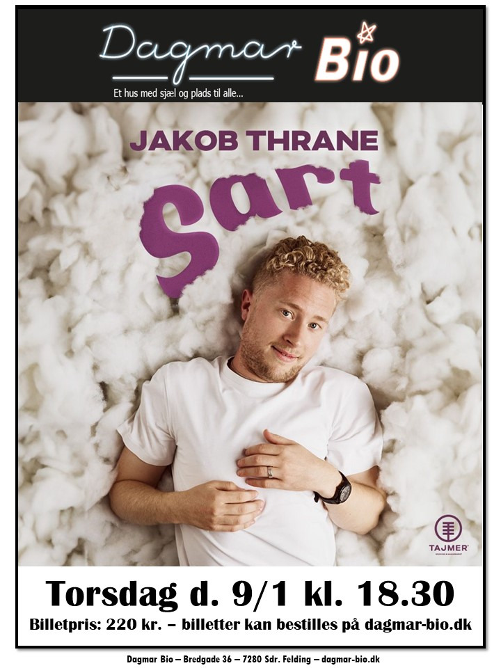 Jakob Thrane er klar med sit tredje onemanshow, "Sart", hvor han tager publikum med på en humoristisk rejse gennem hverdagens små absurditeter. Showet sætter fokus på, om vi alle er blevet for sarte i den moderne verden, og Jakob udforsker dette spørgsmål med sin karakteristiske selvironi og skarpe humor.